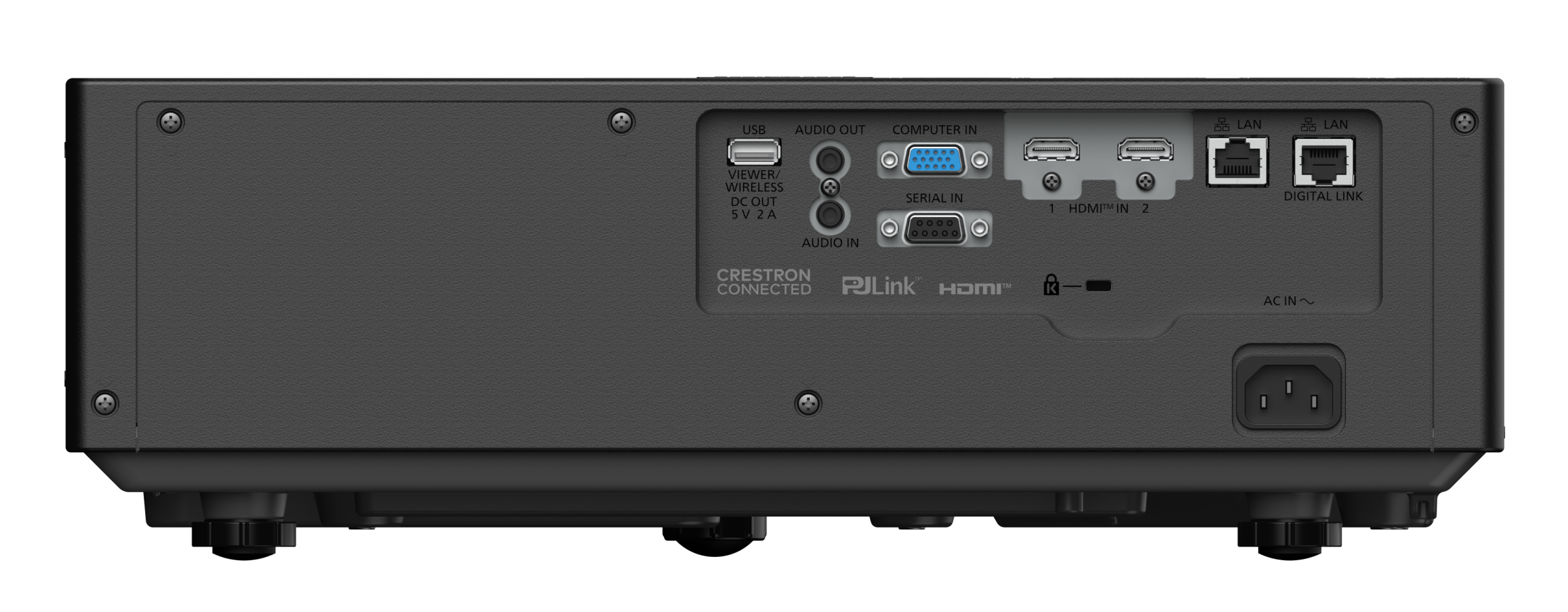 2 x HDMI IN (HDMI 19‑pin), 1 x Computer IN (D‑sub 15‑pin), 1 x Audio IN (M3 stereo mini‑jak), 1 x Audio OUT (M3 stereo mini‑jak), 1 x Serial IN (D‑sub 9‑pin, RS‑232C), 1 x Digital Link / LAN (RJ‑45), 1 x LAN (RJ‑45), 1 x USB Type‑A (Memory Viewer, isteğe bağlı kablosuz modül veya güç çıkışı için)